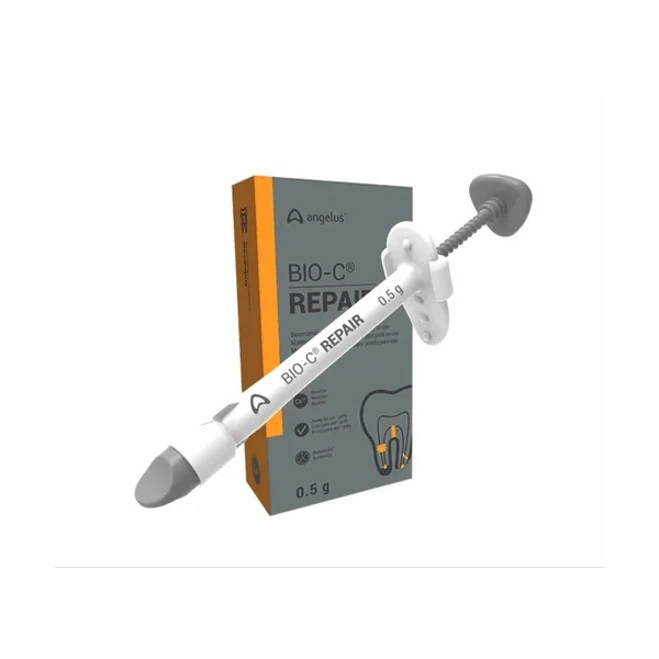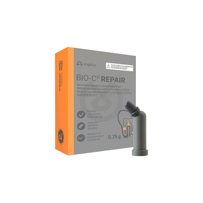 BIO-C Repair Made by Angelus Biokeramički reparativni cement spreman za upotrebu. Putty. Indikacije: - Perforacije ili furkacije korijena kanala - Liječenje unutarnje resorpcije kroz kanal - Izravno i neizravno prekrivanje pulpe - Pulpotomija Karakteristike: - Visoko oslobađanje iona kalcija - Visoka alkalnost (ph~12) - Bez bizmut oksida - Hidrofilan - Sastav bez smole - Netoksičan Prednosti: - Jednostavna uporaba i umetanje u kavitet - Potiče regeneraciju tkiva - Omogućuje upotrebu u vlažnim okruženjima bez gubitka svojstava - Veća reaktivnost, ubrzavanje procesa ozdravljenja - Potiče regeneraciju tkiva - Vrijeme stvrdnjavanja do 2h